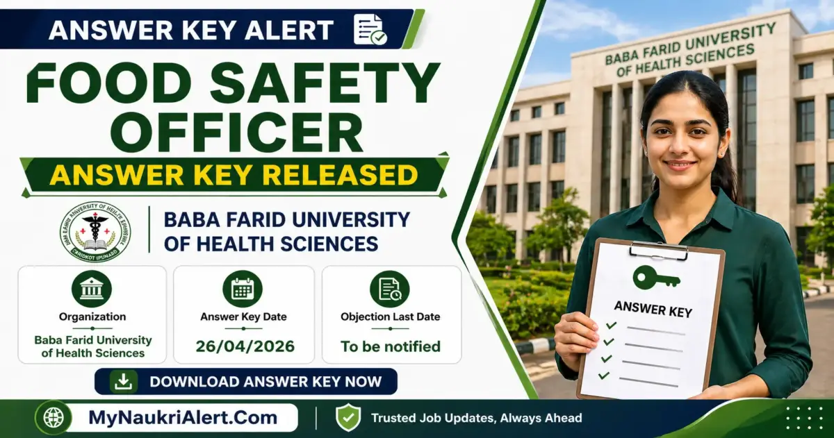 BFUHS Food Safety Officer Answer Key 2026 has been officially released by the Baba Farid University of Health Sciences. Candidates who participated in the Food Safety Officer examination conducted on 26/04/2026 can access the provisional answer key from the official website bfuhs.ggsmch.org. This recruitment drive aims to fill a total of five vacancies for the Food Safety Officer position.