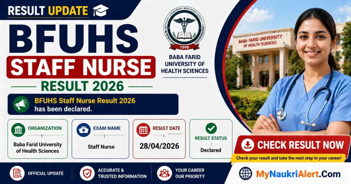 BFUHS Staff Nurse Result 2026 has been officially declared by Baba Farid University of Health Sciences on 28th April 2026. This announcement brings great news for the thousands of candidates who appeared for the examination held on 12th April 2026. Candidates can now verify their qualifying status and download the provisional result PDF from the official portal bfuhs.ac.in or bfuhs.ggsmch.org.