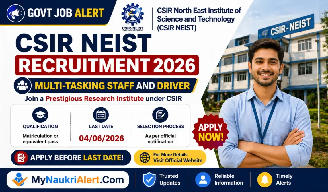 CSIR NEIST Recruitment 2026 notification has been officially announced for the positions of Multi-Tasking Staff (MTS) and Driver (Non-Technical). This opportunity from the CSIR – North East Institute of Science & Technology (CSIR NEIST) offers a total of 10 vacancies for enthusiastic candidates looking to build a career in a reputable organization. The application process has commenced on 05 May 2026 and will remain open until 04 June 2026. Interested candidates can find more details and apply online through the official website www.neist.res.in.