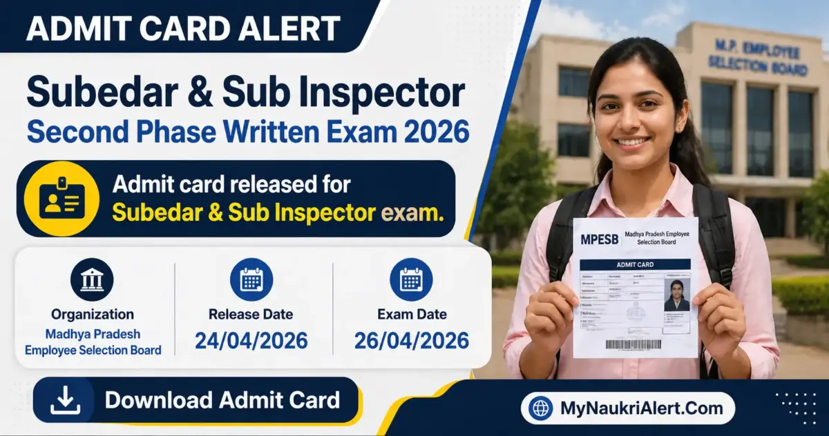 MPESB Subedar, Sub Inspector Second Phase Admit Card 2026 is now available for download. The Madhya Pradesh Employee Selection Board (MPESB) has officially released the admit card on 24 April 2026 for candidates who successfully qualified the first phase and paid the required fee for the second phase of the MP Police Subedar & Sub Inspector Recruitment Test 2025. This important examination is scheduled to take place on 26 April 2026. It is essential for candidates to have their admit cards to gain entry to the examination hall. For detailed instructions on how to download the admit card, exam details, and other important information, please refer to the sections below.