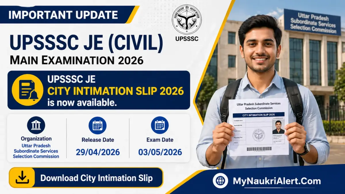 The City Intimation Slip was officially released on 24 April 2026, and the examination is scheduled for 03 May 2026. Candidates should be aware that the admit card will be available approximately four days before the exam date, expected to be released by the end of April 2026. This article offers a direct download link, detailed instructions, and all necessary information regarding the UPSSSC JE City Intimation Slip 2026.